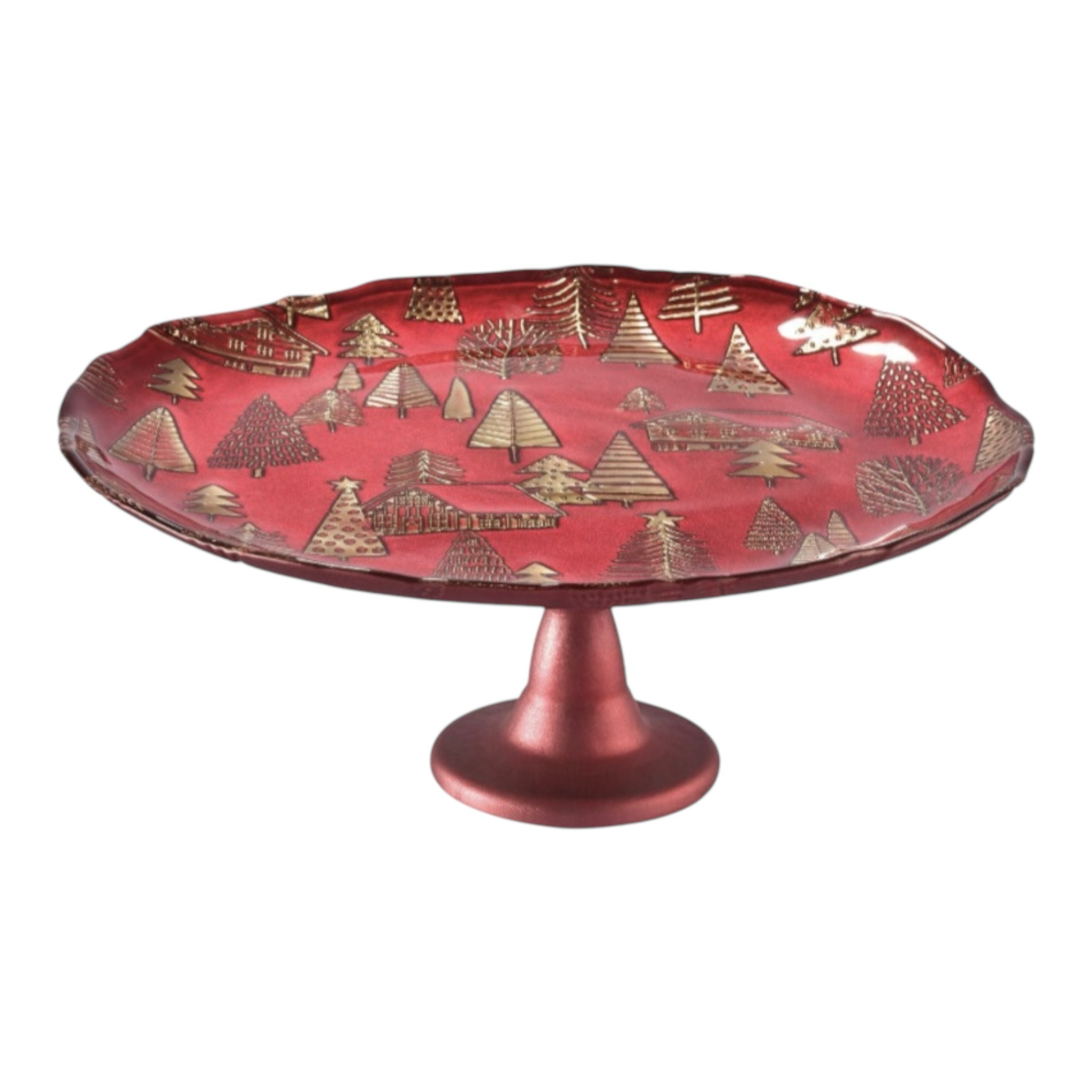 Alzata Della Collezione Di Natale Targato ONLYLUX, Realizzato in Vetro Soffiato di Colore Rosso e Oro Giallo A Forma Circolare Con Disegni Di Albero e Casetta. Ha Una Dimensione di Diametro 33 cm.