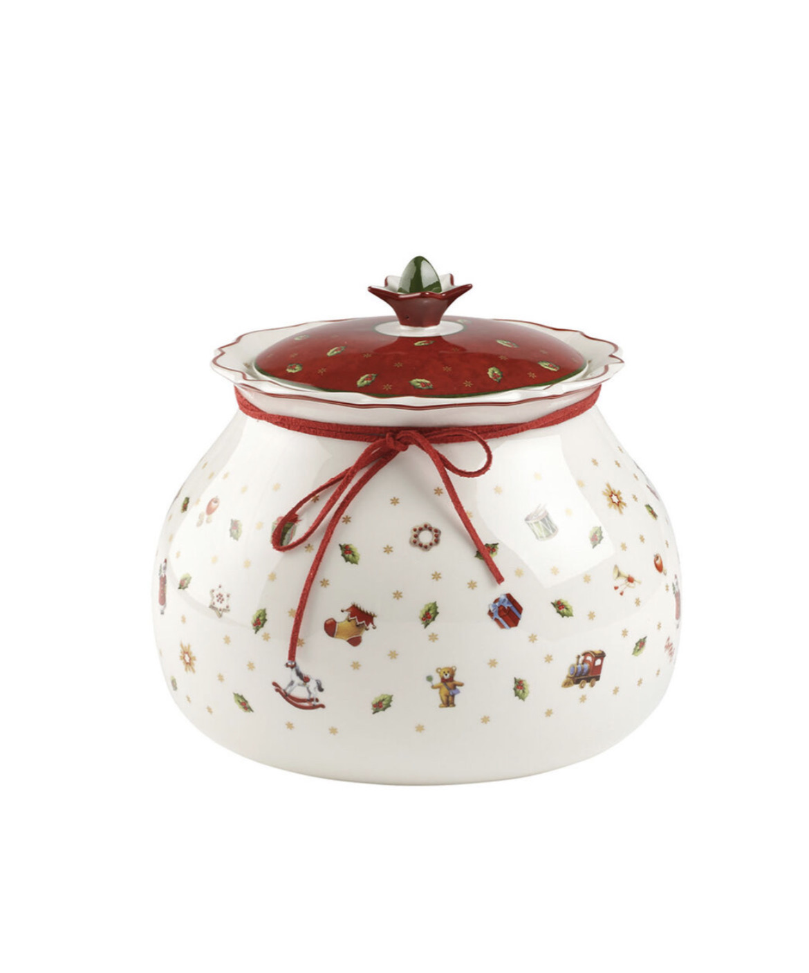 Per biscotti e pasticciniCon la collezione Toy’s Delight porterete una nostalgica atmosfera natalizia nella vostra casa. La porcellana è decorata con graziosi motivi color rosso, verde e bianco e rievoca ricordi d’infanzia. Da abbinare, collezionare e regalare. Per i golosi c’è il grande barattolo natalizio. Al suo interno potete nascondere prelibati biscotti fatti in casa o altre leccornie e si conserva tutto a lungo. Fate felici i vostri cari. Diametro cm.21