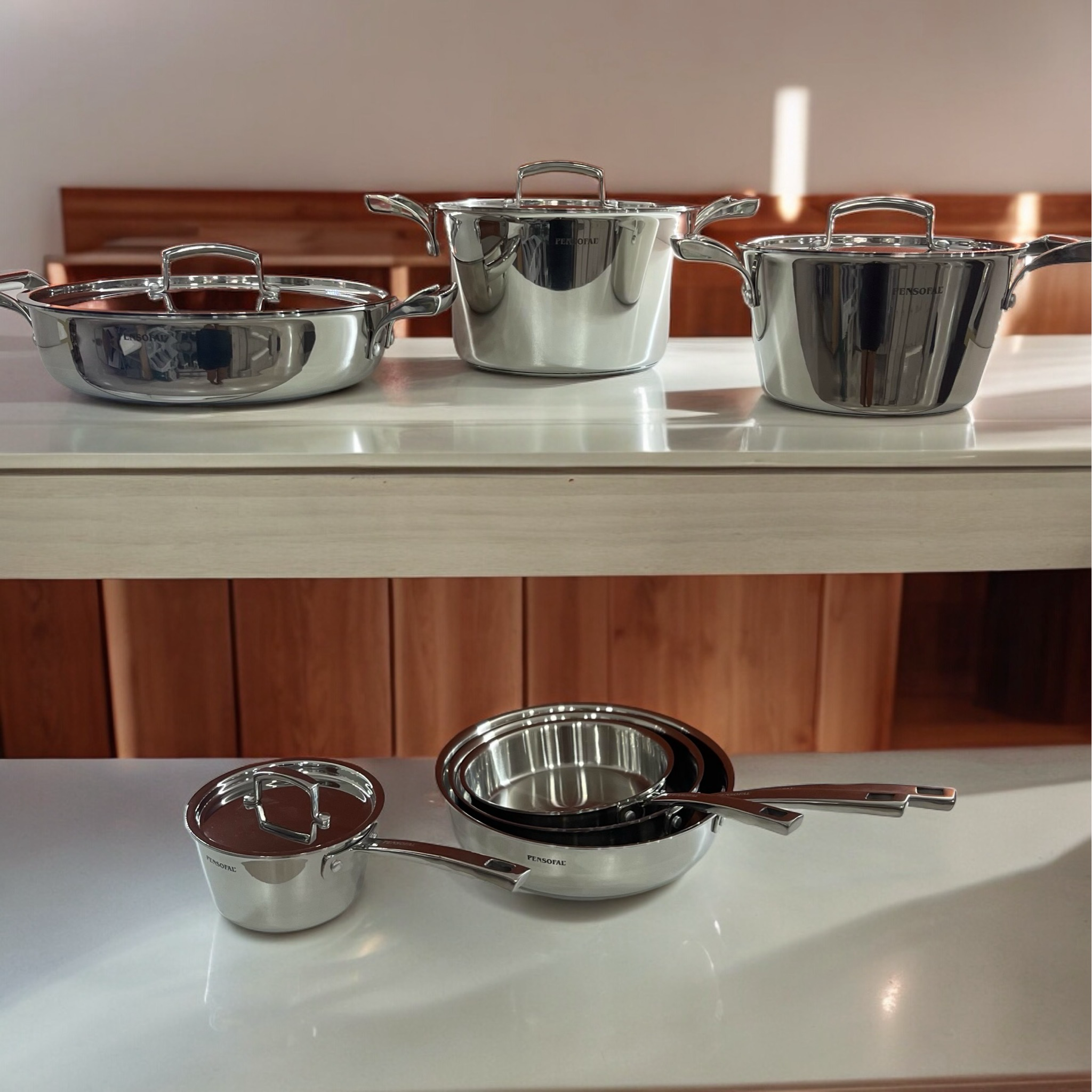 La collezione Royal è una linea innovativa di pentole dall’estetica raffinata e funzionale che riprende nelle forme la solidità della tradizione ma si distingue per le soluzioni tecniche esclusive e all’avanguardia.Di grande versatilità e resistenza, interpreta i desideri degli appassionati e chef più esigenti grazie alla perfetta unione tra alluminio e acciaio inox.La combinazione dei 5 strati (3 sul corpo: – Acciaio inox 18/10 – Alluminio intermedio – Acciaio inox 18/10 + 2 strati sul fondo “Sandwich” – Alluminio – Acciaio inox per induzione) assicura una perfetta ed omogenea diffusione del calore dal fondo fino al bordo delle pareti con conseguente ottimizzazione dei tempi di cottura e relativo risparmio energetico.I manici e le maniglie frutto di studio e progettazione di designer internazionali, realizzati in fusione di acciaio, sono resistenti al calore e rendono la linea adatta all’utilizzo in forno.La linea Royal è adatta a chi soffre di intolleranze ai metalli pesanti.La batteria comprende : casseruola alta cm.24 due manici – casseruola alta cm.20 due manici – casseruola cm.16 un manico – tegame cm.28 due manici – padella cm.20 – padella cm.24 – padella cm.28’- coperchio cm.16 – coperchio cm.20 – coperchio cm.24 – coperchio cm.28