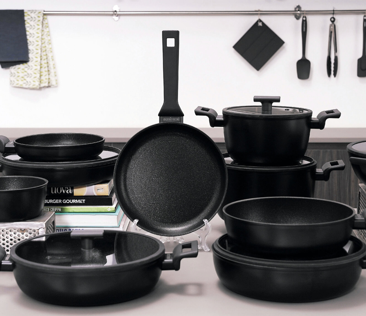 Padella cm.20, 24, 28;Padella alta cm. 20, 24, 28, wok cm.30 con coperchio;casseruola 1 manico cm 16;casseruola 2 manici cm.20, 24, 28 con coperchio; tegame cm.24 , 28 con coperchio,—Linea premium di altissima qualità.100% Made in Italy.I condimenti restano al centro facilitando una cottura uniforme.Cucina più sana con meno oli e grassi aggiunti.4 volte più resistente rispetto ai competitor sul mercato.Antimacchia, resiste a graffi superficiali e agli acidi naturali degli alimenti.Strato in titanio, rinforzo e finitura con polvere di diamante e particelle minerali ad elevata durezza.Double Induction: due dischi in acciaio inox racchiudono il corpo in alluminio. Non si dilata né si deforma quando riscaldato.Fondo ultrapiatto stabile sul piano cottura, riscaldamento senza dispersioni.Elevata capienza grazie all’angolazione della superficie di cottura e al design ricercato e minimal.Corpo in alluminio, manici in bachelite, coperchi in vetro con sfiatatoio vapore e bordo in silicone.Logo Sambonet inciso sulla ghiera.Estensione per tutti gli usi in cucina.Idonea alla lavastoviglie.
