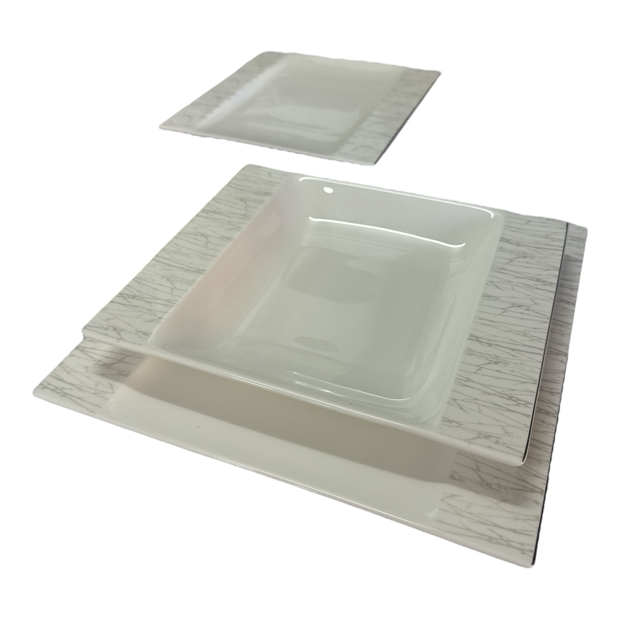 12 piani 12 fondi 12 frutta 1 quadrato 1 rettangolare e 1 insalatiera – porcellana fine bone china – decori platino