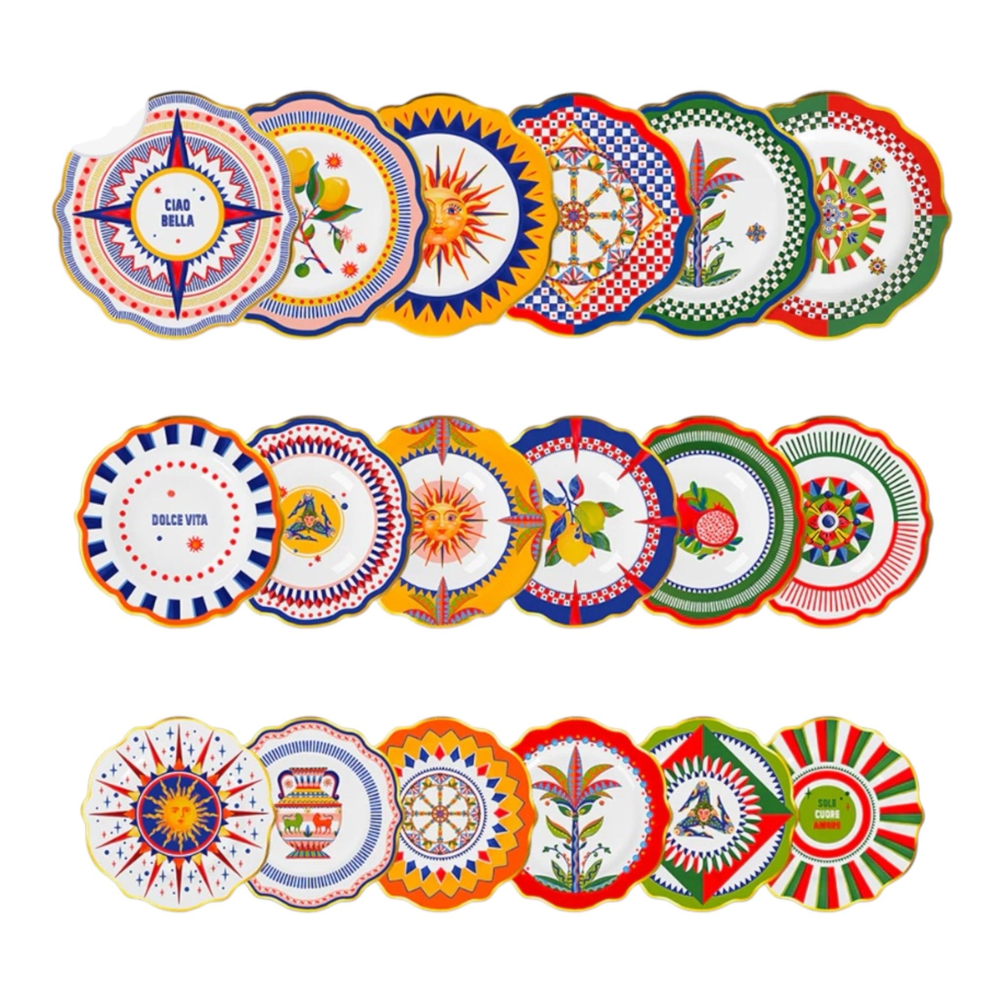 Set 18 pezzi (6 piani 6 fondi 6 frutta) in porcellana della collezione “Dolce vita”, un omaggio all’eleganza naturale dello stile italiano per portare in casa un tocco della dolce vita.Un design che trasmette tutta l’essenza mediterranea grazie ai suoi colori e decori vivaci, espressione autentica del calore e della bellezza del vivere mediterraneo.Lavabile in Lavastoviglie. No Microonde