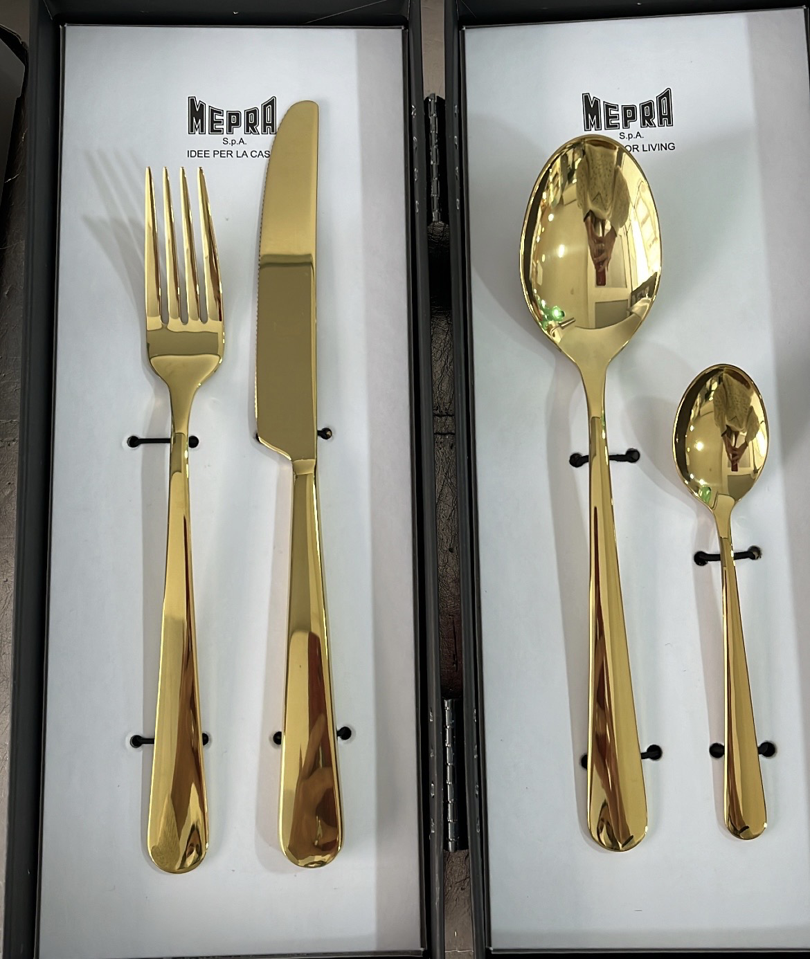 6 forchette 6 coltelli 6 cucchiai 6 cucchiaini – acciaio inox 18/10 finitura PVD oro lucido – lavabili in lavastoviglie