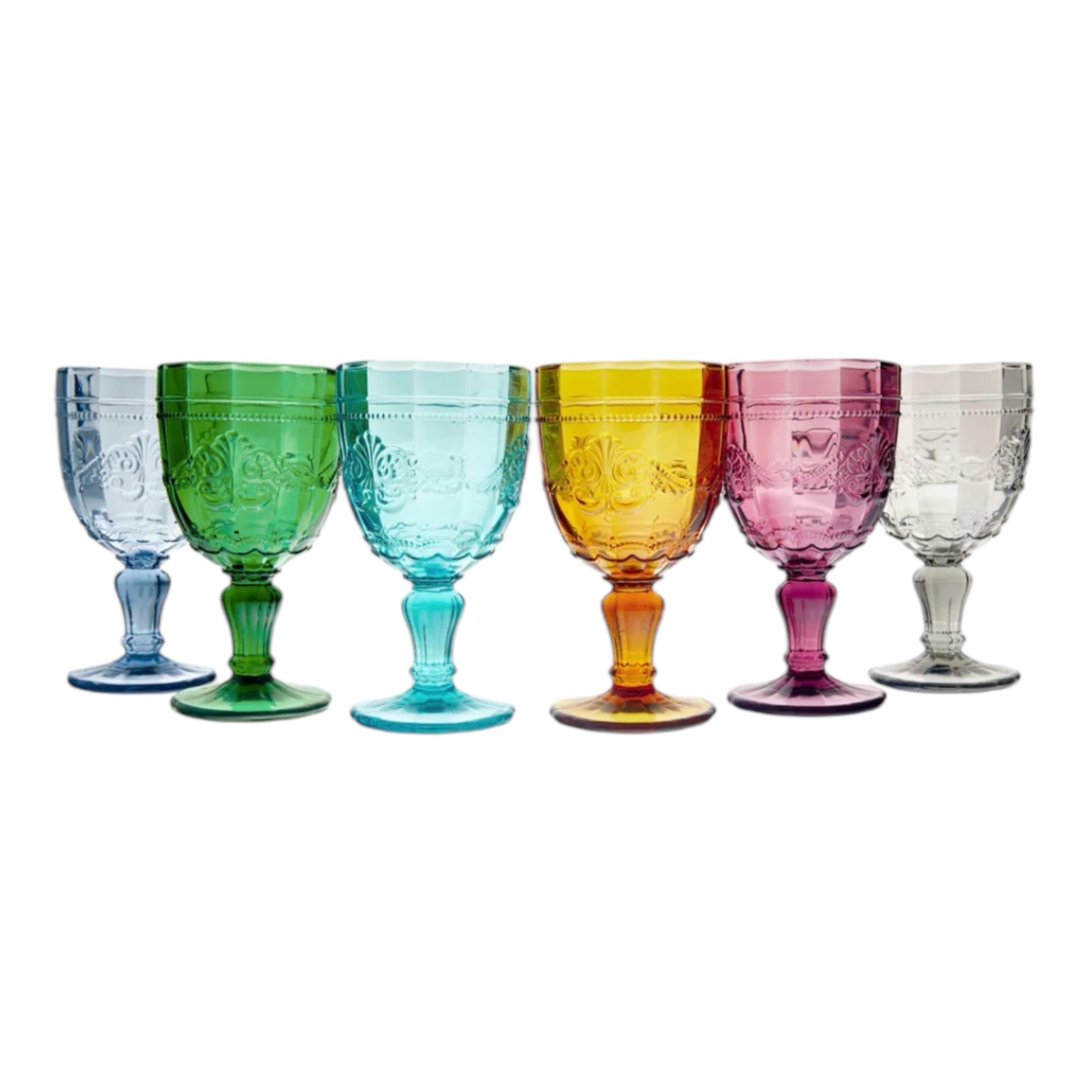 Set 6 calici vino SyrahIn vetroCoppa ampiaDecoro arabescatoMisure: Ø 8 x h. 15,5 cmCapacità: 235 mlLavabile in lavastoviglieIn scatola regaloColore: rosa, blu, acquamarina, verde, ambra, fumè